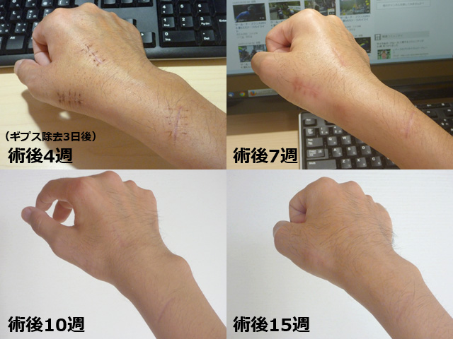 手の甲や手首付近は傍目にもよく見える部分であり、術後の傷痕を心配する方がいるかもしれません。女性はもちろんのこと、男性でも職業によっては気になるところでしょう。ギプスが外れてからは、傷の治りはあっという間でした。切開痕も日を追うごとに目立たなくなっていきます。自身の体質や、執刀医の技量にも左右されるようですが、ある程度馴染むまで術後10週ほどは必要でしょう。傷痕を極力目立たなくする縫合方法もあるようなので、気になる方は事前に医師に相談してみてください。